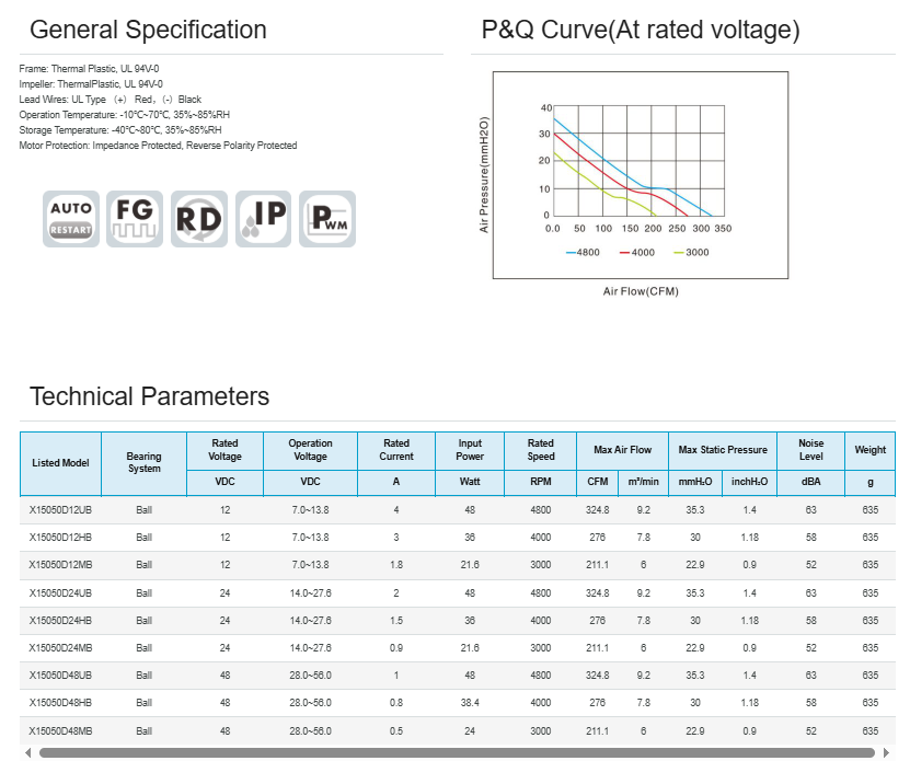 For less restrictive applications, models are available with a static pressure of 14.9 mmH₂O. The P&Q (Pressure vs. Airflow) curve provided in the specifications illustrates this trade-off, showing how the DC fan will perform across a range of system resistances, allowing engineers to choose the ideal operating point for their specific design.